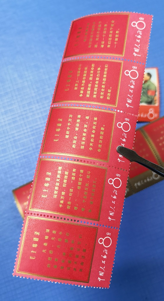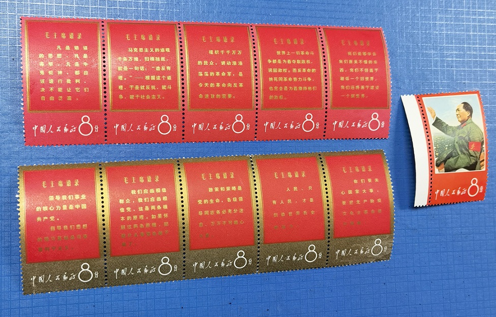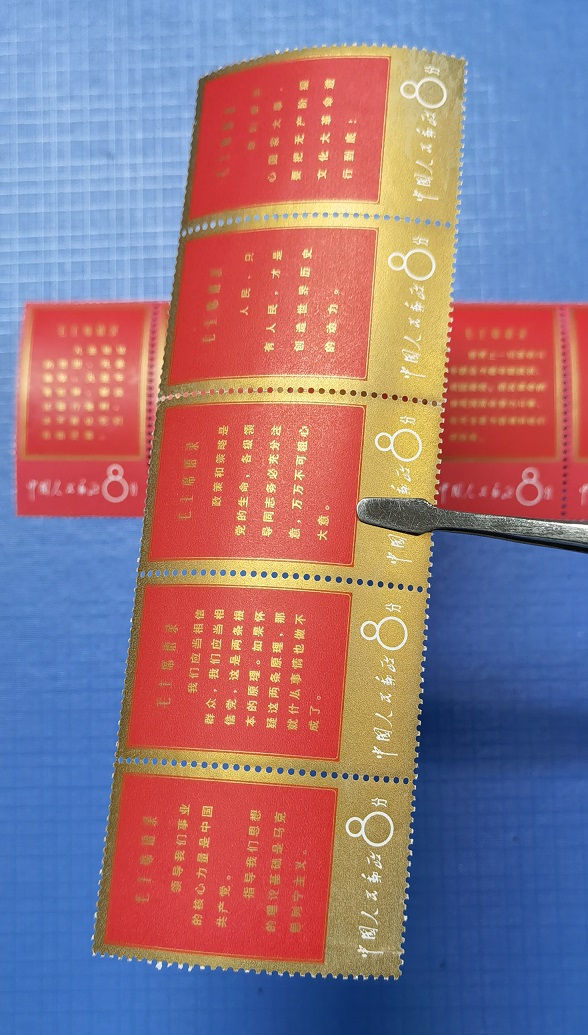 卖文1毛主席语录一套:原胶上品,金边金粉有氧化,两条连票齿间各有一折,红边和金边背面白净无黄,招手全品。整套无人为。如图所示,低售12800元包邮