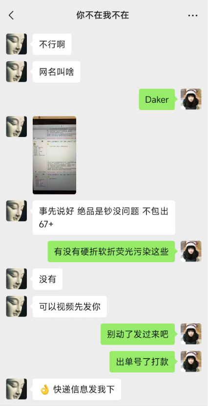 微信聊天中,卖家确认无硬折软折,无荧光污染,到货后,开箱视*频验证有荧光污染,卖家不承认。