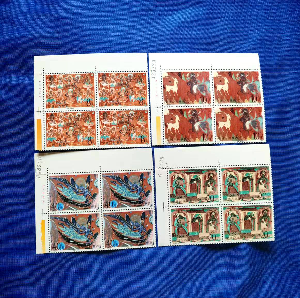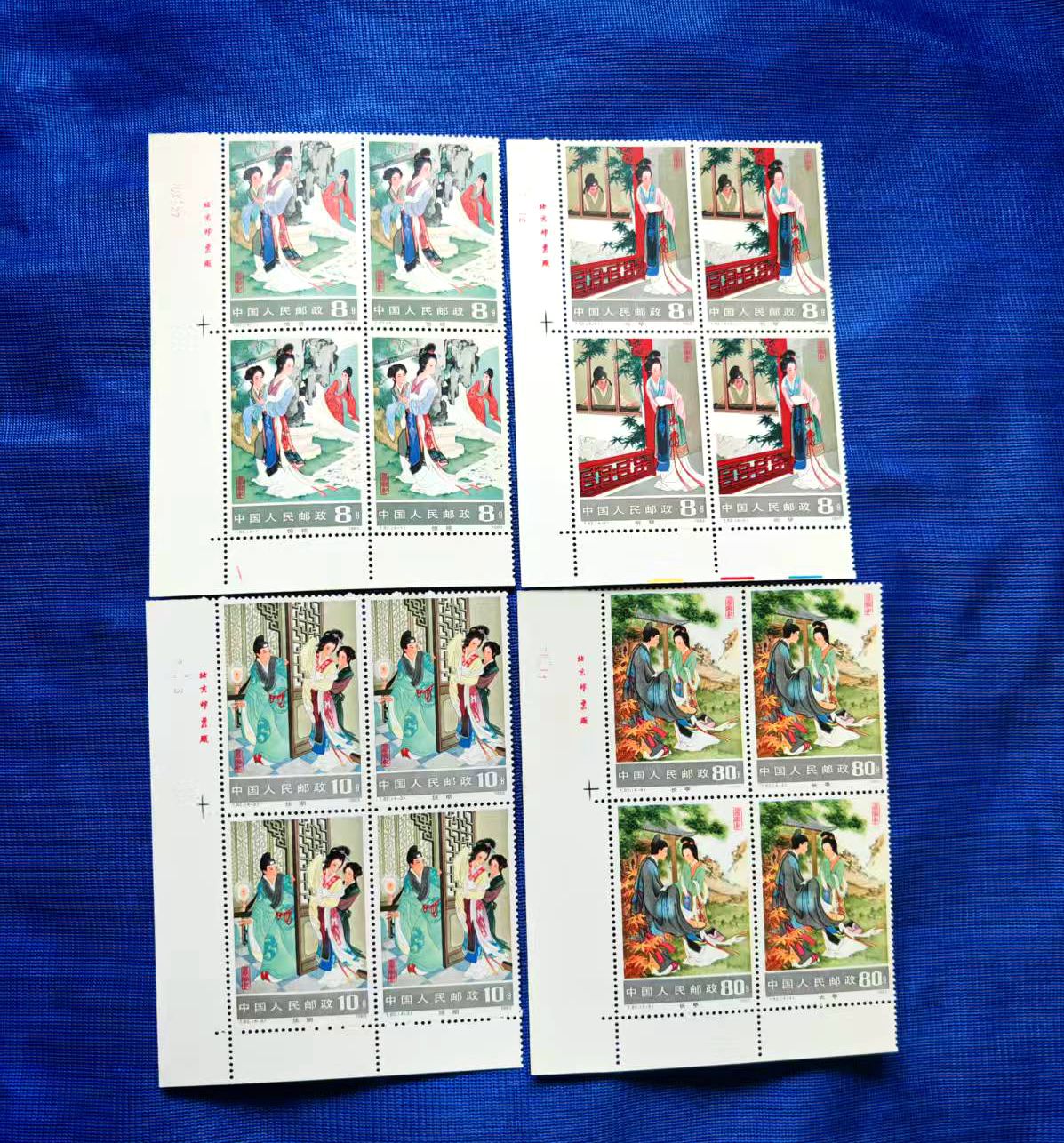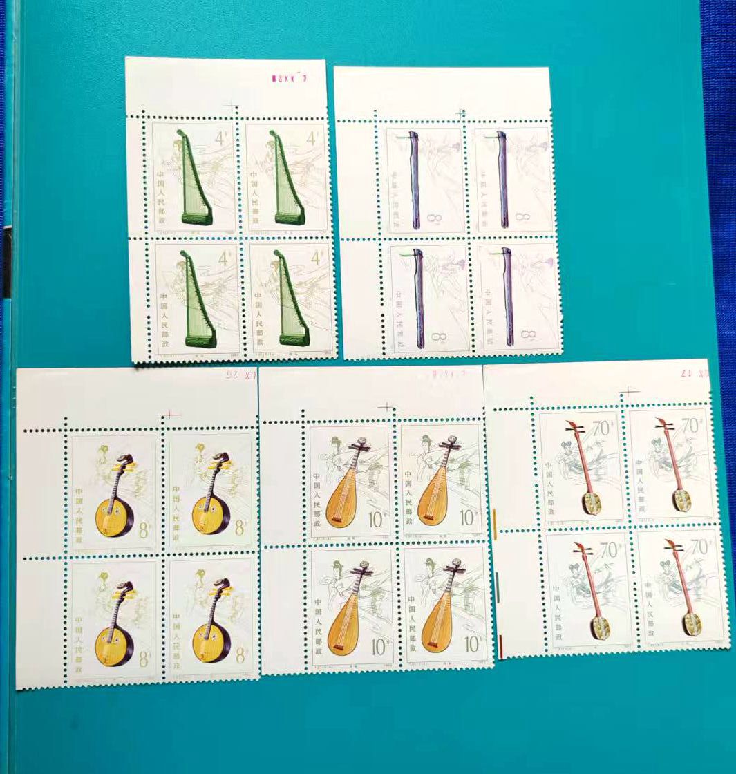 品相如图,色艳全品,西厢记直角厂名方联560元、乐器直角方联500元、敦煌一色标方联(上边齿孔有折)130元、泰山直角方联80元、文学家花边直角150元、航天直角方联60元,包品包邮,不满意包退费用自理(要求全品吻扰)