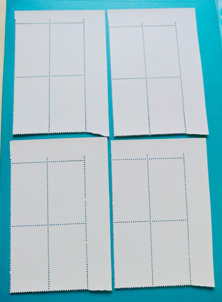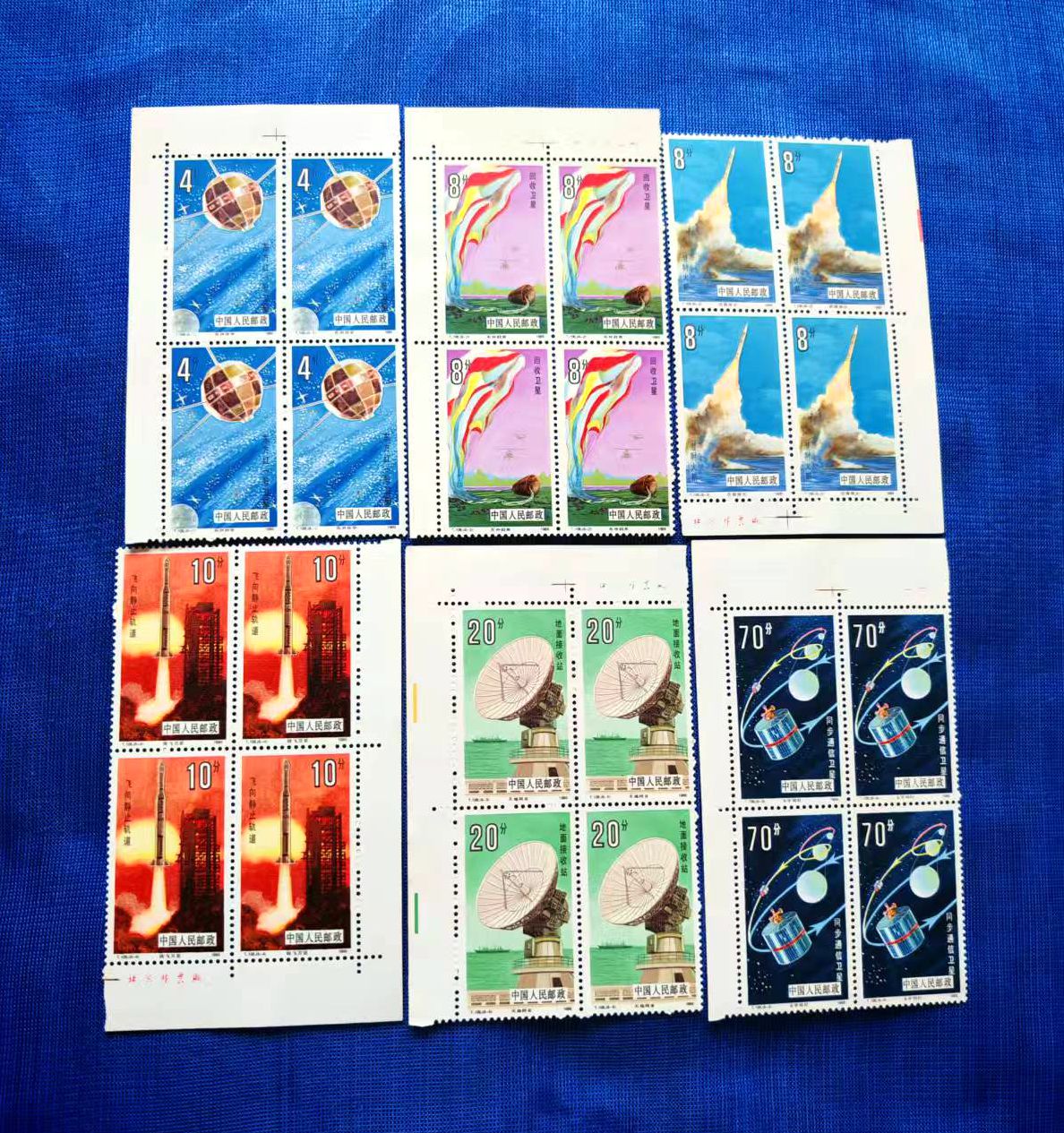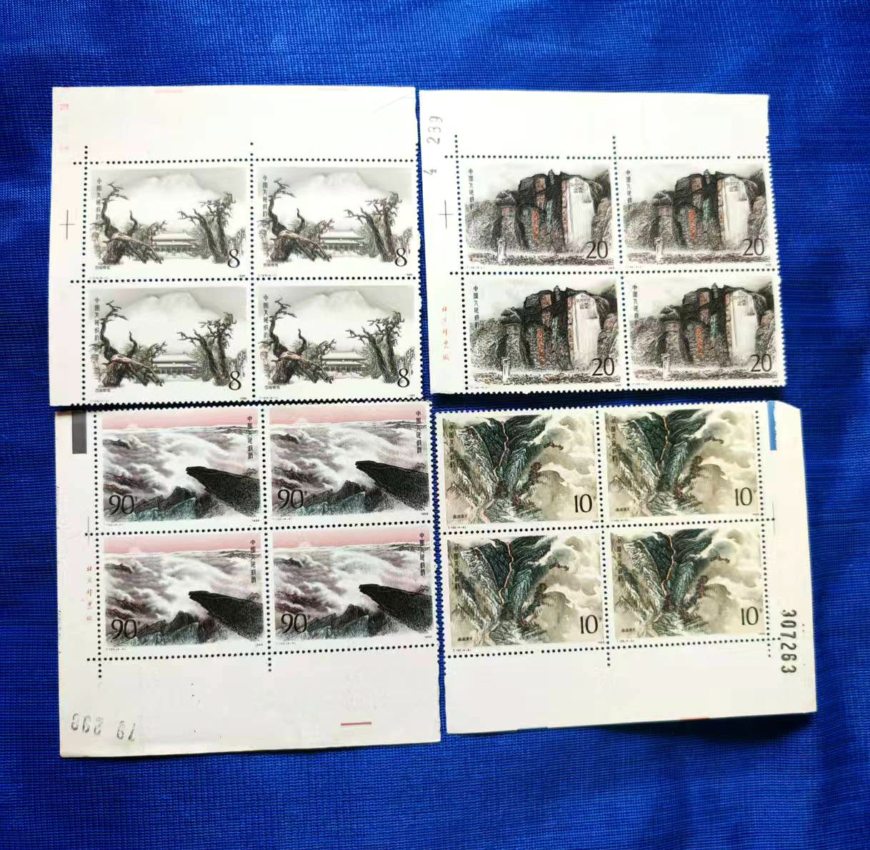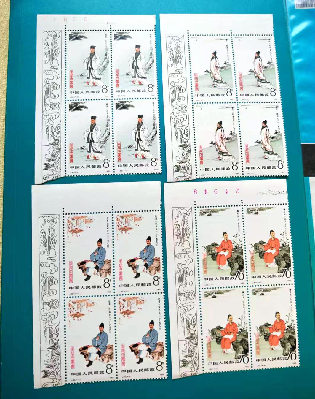品相如图,色艳全品,西厢记直角厂名方联560元、乐器直角方联500元、敦煌一色标方联(上边齿孔有折)130元、泰山直角方联80元、文学家花边直角150元、航天直角方联60元,包品包邮,不满意包退费用自理(要求全品吻扰)