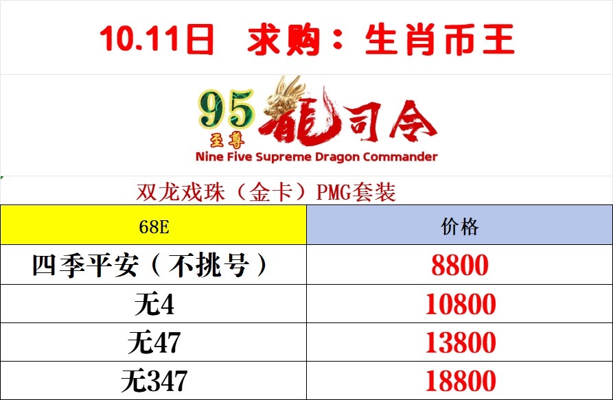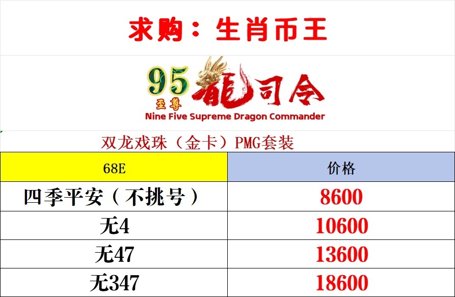 求购PMG68分金卡装帧95至尊龙司令,价格如下,有货朋友请支持,另组建生肖币王微信群,由于群已经过200人请添加群主微信进群