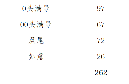 出蛇无347散张262张,(如图0头和00头满号164张,双尾72张,如意号26张