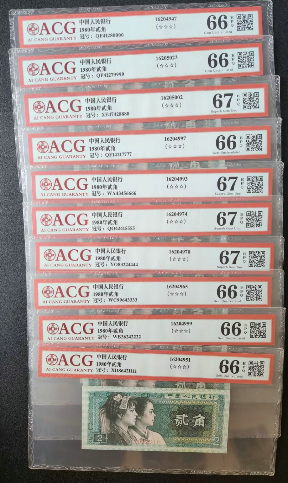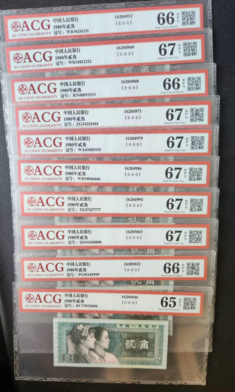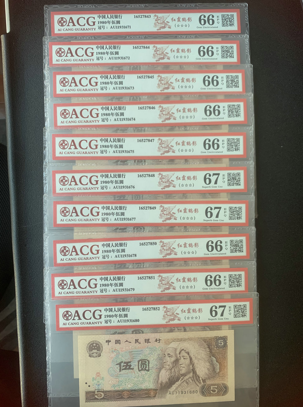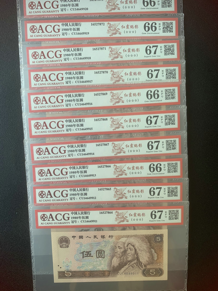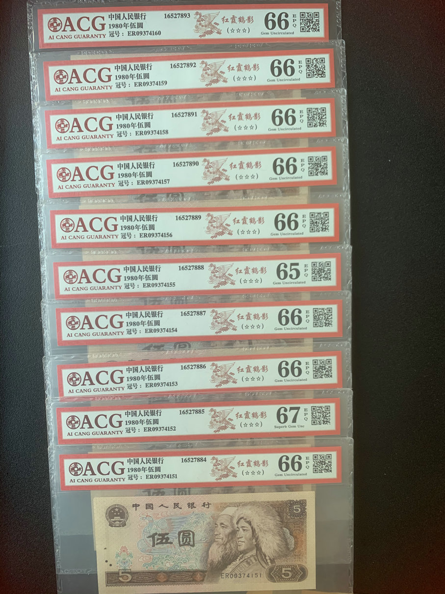 805评级币红霞鹤影AU稀少冠号标十700元,CU标十600元一组 ER标十600元。