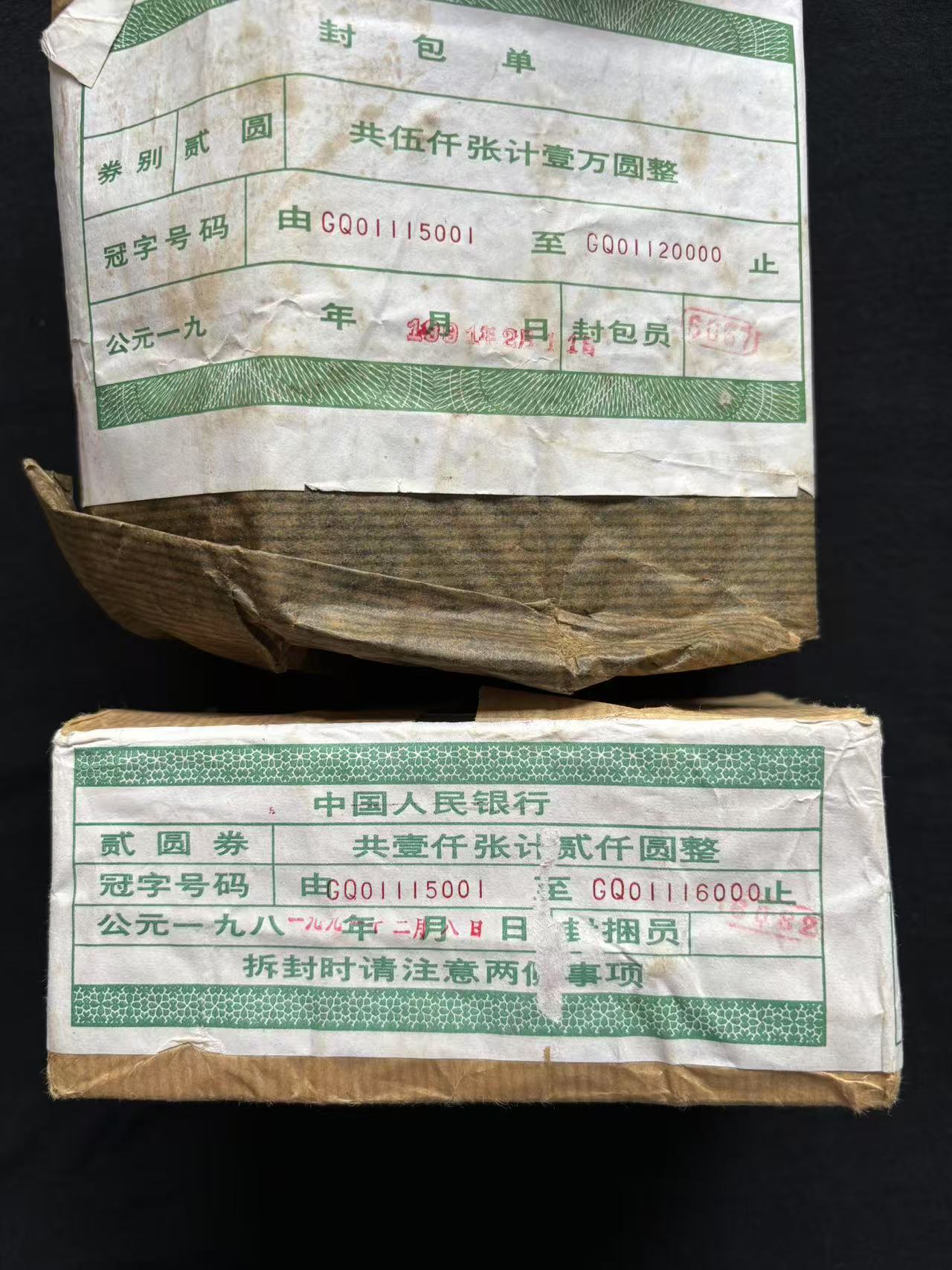 802早期特稀GQ冠,包拆原捆靓号,人3张张中间豹,金马王,灯下无斑,包装裂(币拿不出,裂口处角灯下有2个极小油点),西北干货,银行一手,品质保证!纸包装里面品相算极好的了,送原封包单,惜售5.3万,喜欢联系!