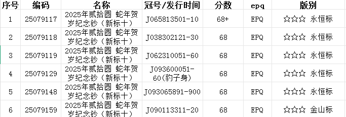 蛇钞无47标十,8张,爱藏68,有一组是68+