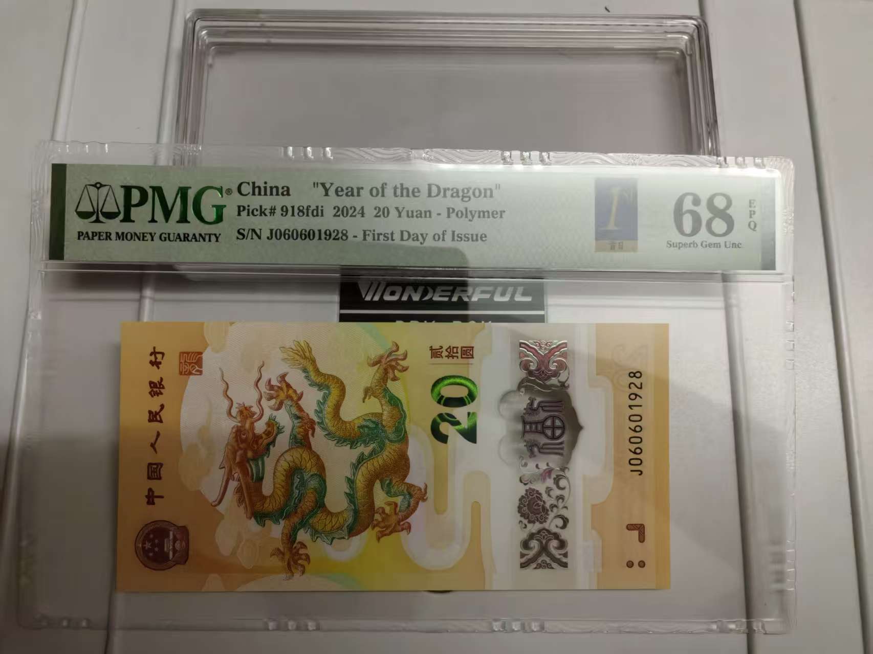 7688出金兰首日标朦胧PMG68分龙钞,号码为J060601928,06圆圆头,1928(龙年)年份尾,生日号,