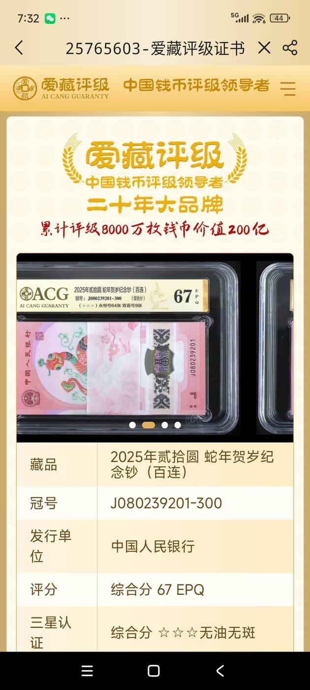 出一刀蛇钞无47的67分尾201标百,6700元包邮