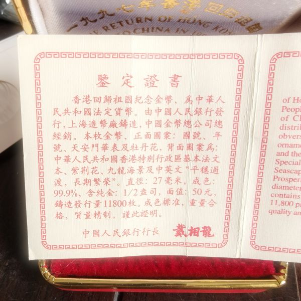 97香港回归纪念金币2分之1盎司15500元