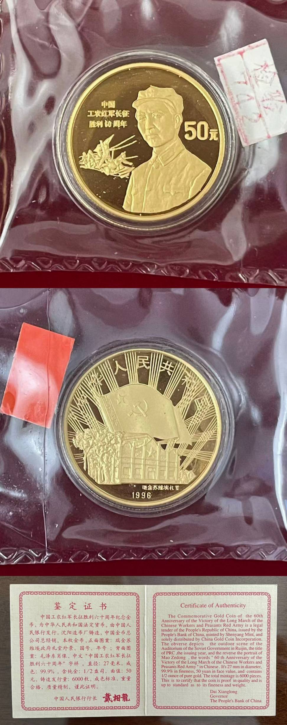 长征六十周年金币,原盒、币全品,证书2651。19600元