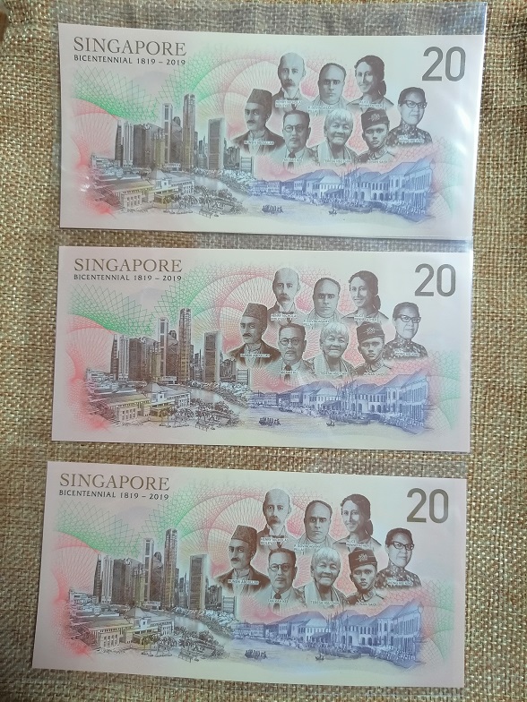 全新20元新加坡元纪念钞4枚(新加坡开埠3枚;新加坡文莱货币等值互换1枚);4枚*150齐售600元包普快。